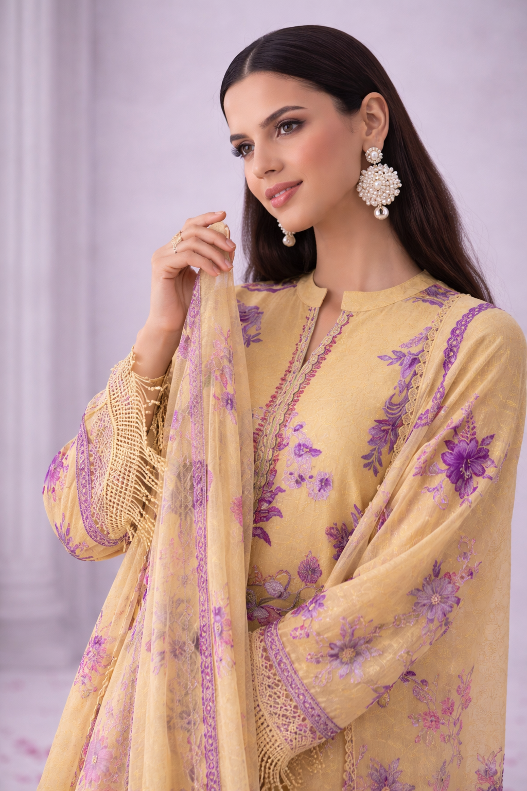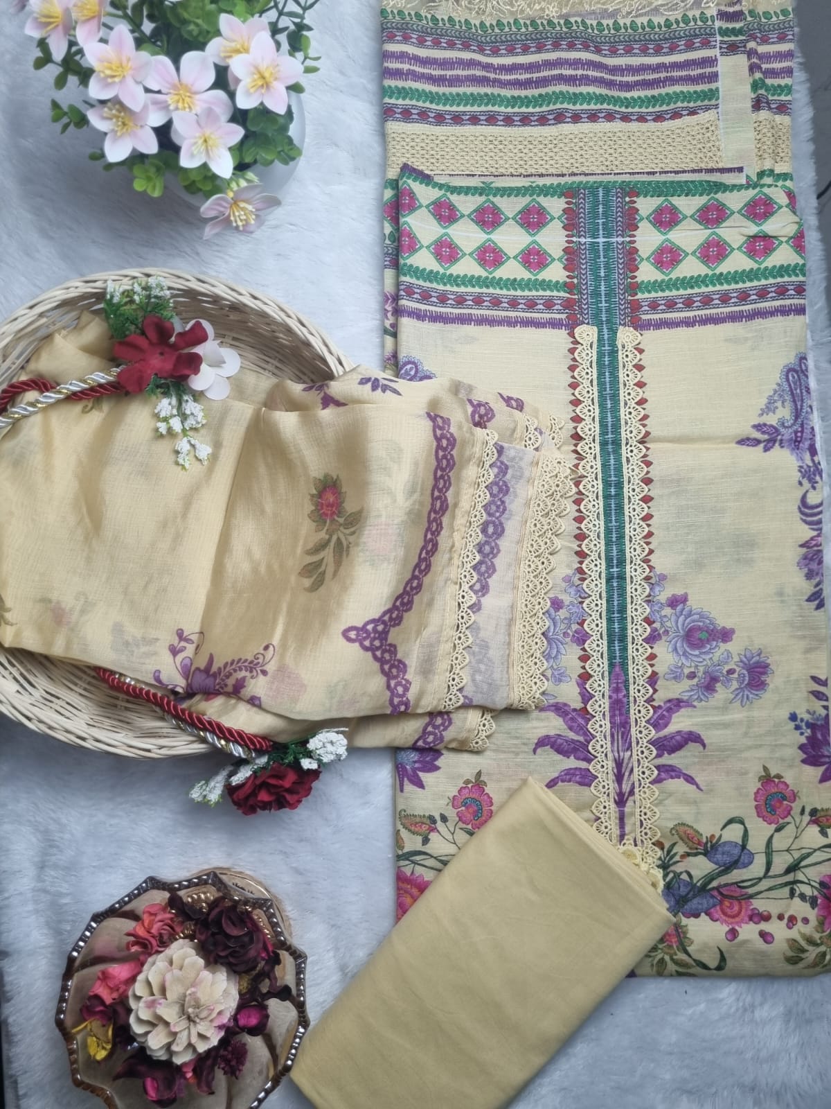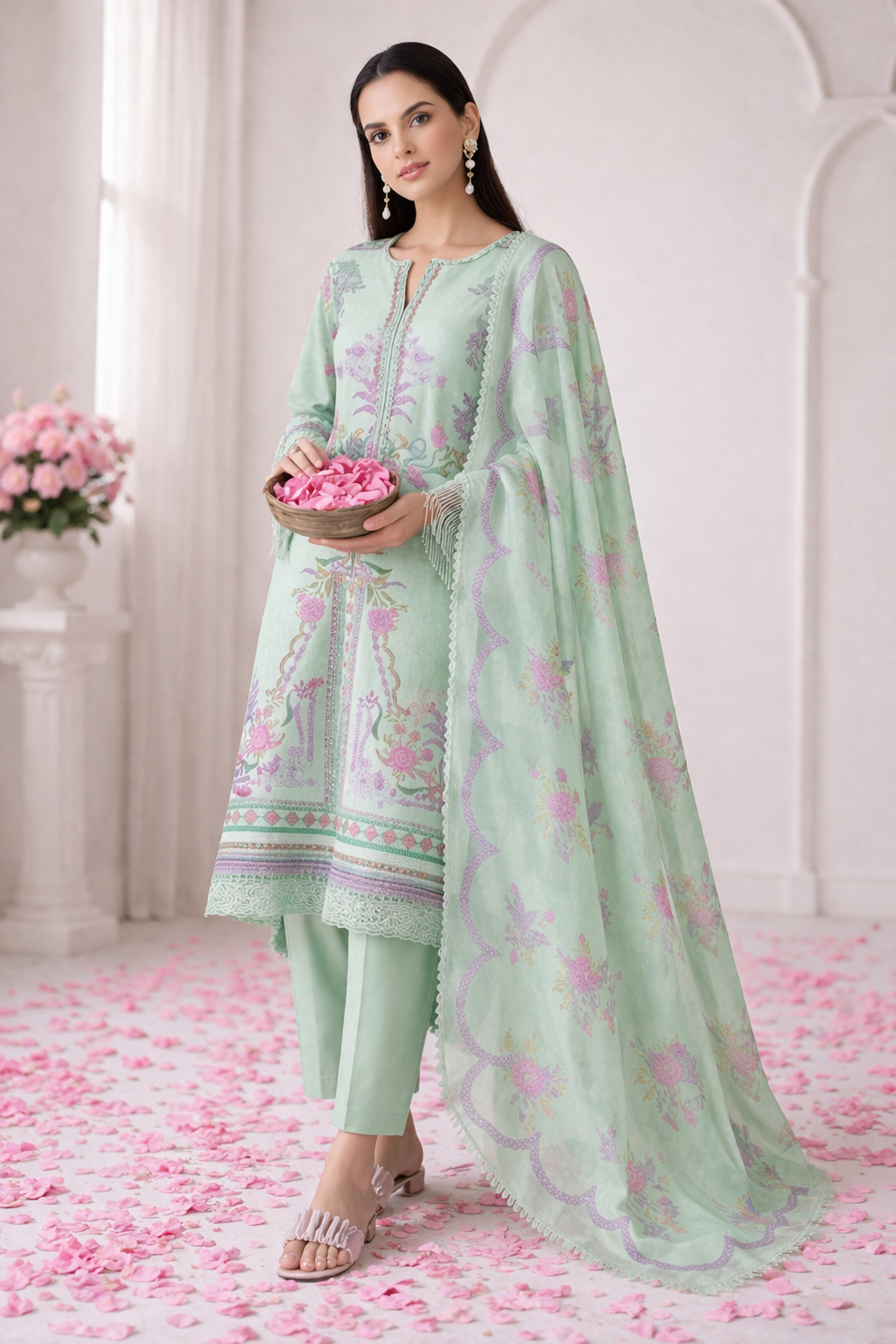 Mint Green Floral Printed Cotton Suit Set with Lace Dupatta